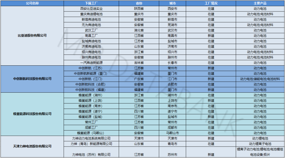 例如,中创新航的江门、厦门基地,蜂巢能源的上饶、盐城基地,力神的苏州、青岛、天津基地,比亚迪的长春、济南、武汉基地等均在短期内陆续开工。