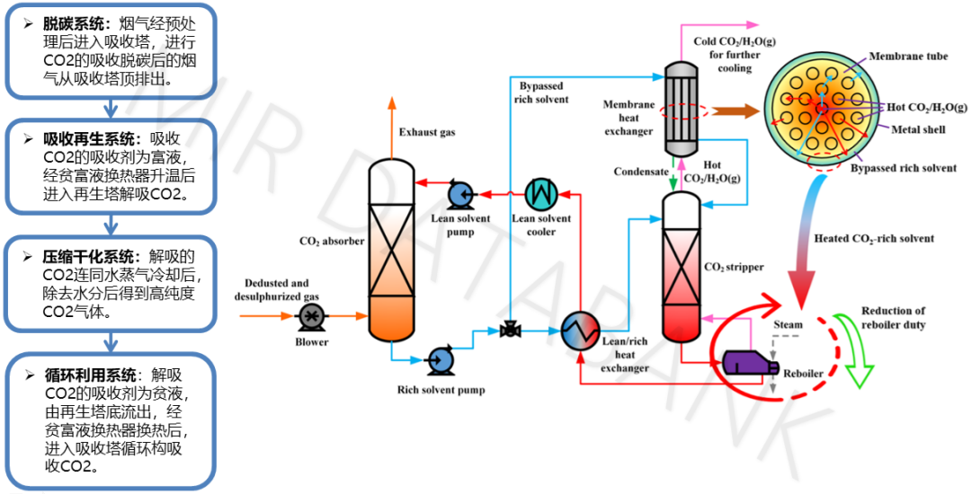 我们以燃烧后捕捉化学吸收法为例,其碳捕捉要经过脱碳-吸收再生-压缩干化-循环利用等环节,涉及到烟气吸收塔、换热器等设备。