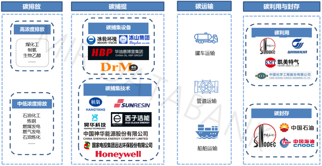 当然碳捕集不是独立存在的技术,在实际生产中,它经常与碳运输、碳利用与封存一起称为CCUS。当下中国的CCUS生态如下所示: