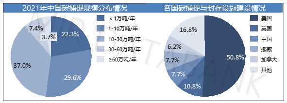 目前,中国已投运和建设中的CCUS示范项目约40个。在30万吨/年以下的项目数量占比达88.9%,规模超过60万吨/年的项目仅占3.7%。放眼全球,在建及拟建的碳捕集与封存设施数量大约在520个,中国占全球总量的7.7%,占比远低于第一名美国的50.8%。由此不难看出:国内碳捕捉技术和商业化应用尚不成熟,项目建造和后续处理成本过高,相比于国外市场差距还很大。