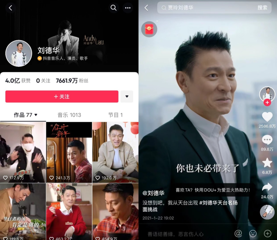 2021年1月,抖音官宣天王巨星刘德华入驻抖音。作为刘德华出道40年来开通的全球首个社交账号,仅12小时破千万粉丝。此后,同年10月,成龙加入快手,第一条短视频发布不到10小时播放量破亿,两天时间内粉丝数突破2000万。