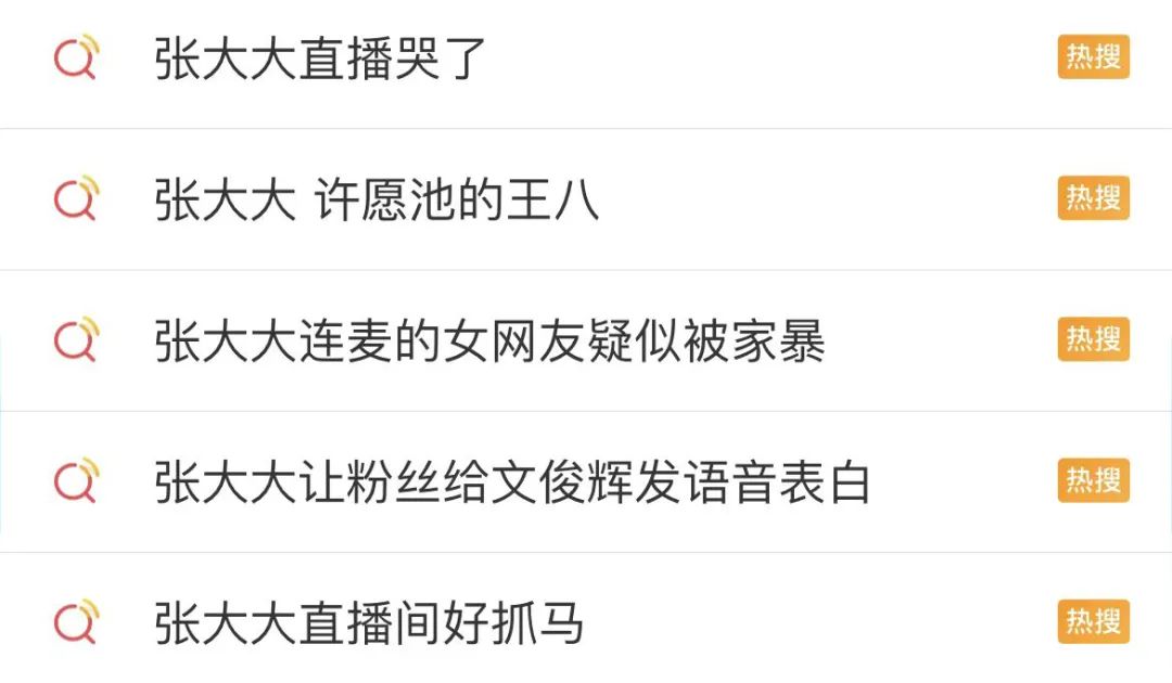 从#张大大直播间有网友相亲#,到#网友连线张大大问bobo组合为什么会分开#,但凡张大大当晚开播,几乎都有相关抓马热搜出现,当网友的要求越离谱,张大大的表情也更窘迫,那一刻他不再是混迹娱乐圈的明星,仿佛是输掉PK连麦的吃瘪网红。