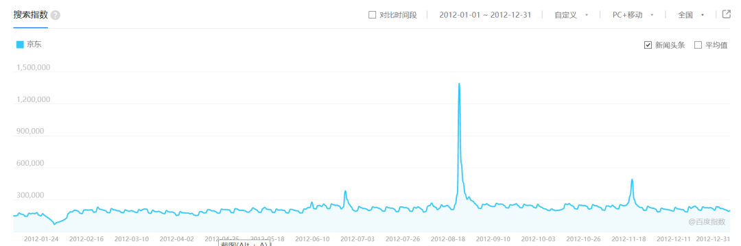 如下图百度指数所示,2012年全年,“京东”有关的百度指数表现皆平平,但在该年8月,京东和苏宁国美两家的价格战对垒期间,百度指数高企,五倍多于往日。这意味着,相关报道层出不穷之余,有关京东的消息频频引来外界的关注,而这对于当时的京东来说,都是免费广告。