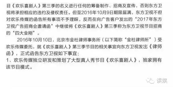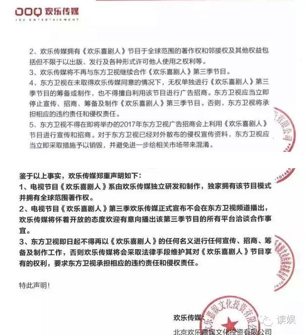 在欢乐传媒对东方卫视的控诉行文中,态度是“委屈”的,意见是“坚决”的……欢乐传媒认为东方卫视对其不理不睬的严重伤害了其作为《欢乐喜剧人》制作方和版权方的尊严!所以欢乐传媒不得不以公开的形式公告天下,丫不和你玩了,第三季要另谋出路….