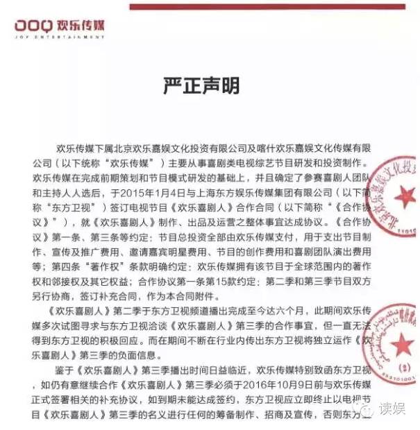 古人云:“苟富贵,莫相忘”。但现实中,读娱君认为是“苟富贵,开始撕”,就不说张靓颖和王宝强这两大刷屏事件,就光是电视圈的“富贵”后开撕的事儿就屡见不鲜:《甄嬛传》的作者和片方之间的版权纠纷、《中国好声音》版权方和灿星的纠纷,不一定是火了必撕,而是没火的时候撕也没人知道,在经过多年养成、喜剧综艺成了一门大生意后,喜剧综艺的标杆之后的《欢乐喜剧人》的制作方和品牌拥有者欢乐传媒就用一张声明诉说东方卫视对其的漠视,并很委屈的公告天下第三季不会在东方台播出了!
