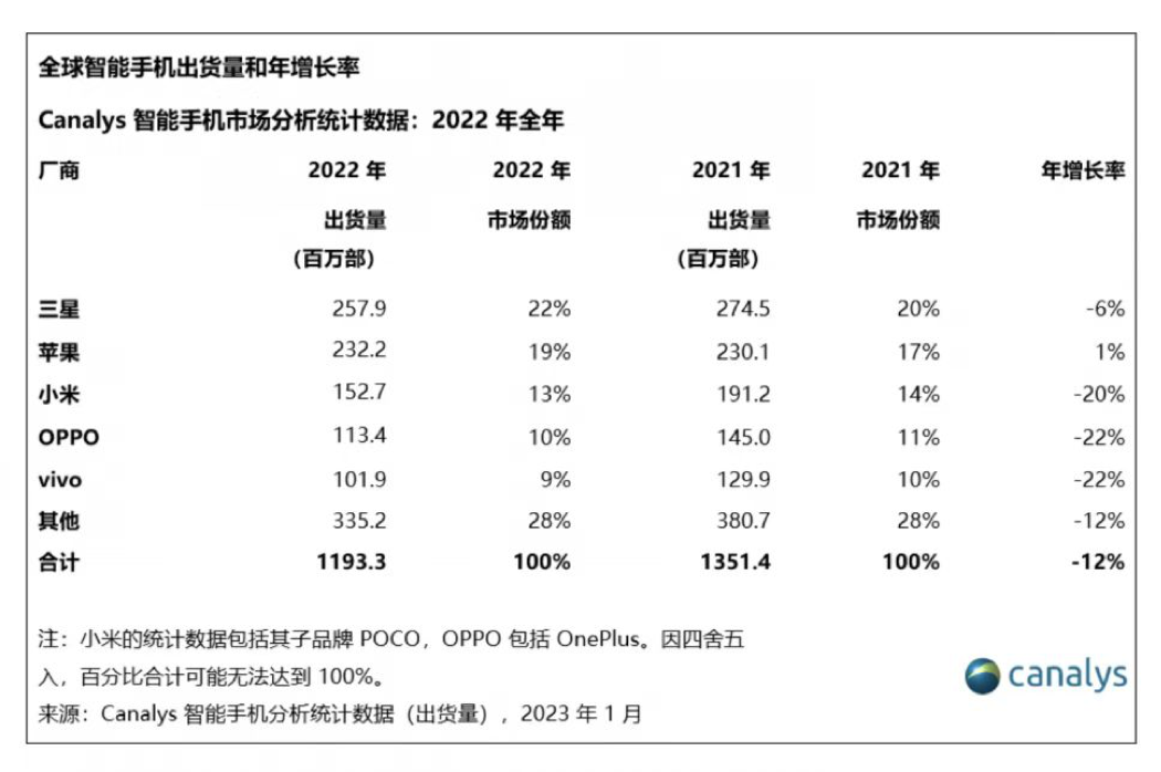Canalys的数据显示,2022年各厂商的总出货量不足12亿部,导致全球年出货量下降12%。