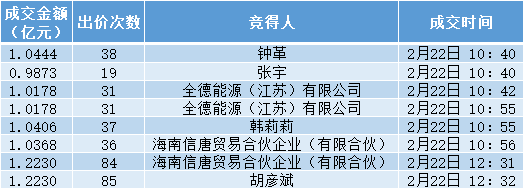 从竞得人来看,全德能源(江苏)有限公司(下称全德能源)、海南信唐贸易合伙企业(有限合伙)(下称海南信唐)均连续竞得两个标的;钟革、张宇、韩莉莉、胡彦斌四位自然人分别竞得一个标的。