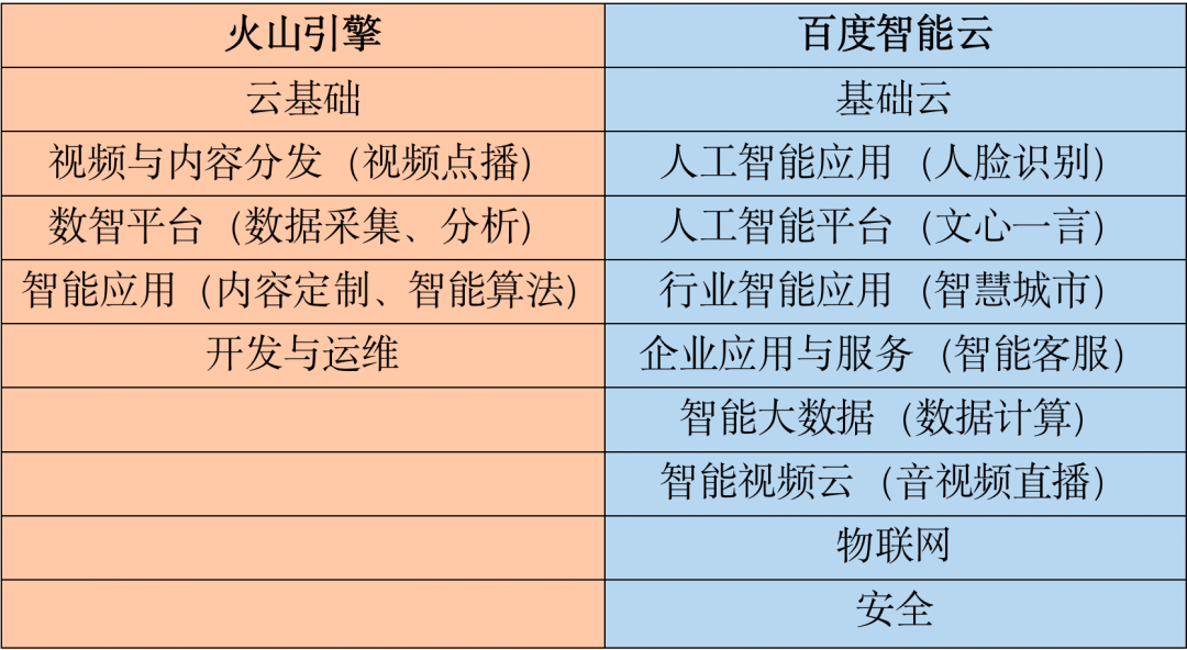 火山引擎目前主要涉及云基础、视频与内容分发、数智平台、智能应用、开发与运维这些板块;百度智能云涉及基础云、人工智能应用、人工智能平台、行业智能应用、企业应用与服务、智能大数据、智能视频云、物联网、安全等板块。