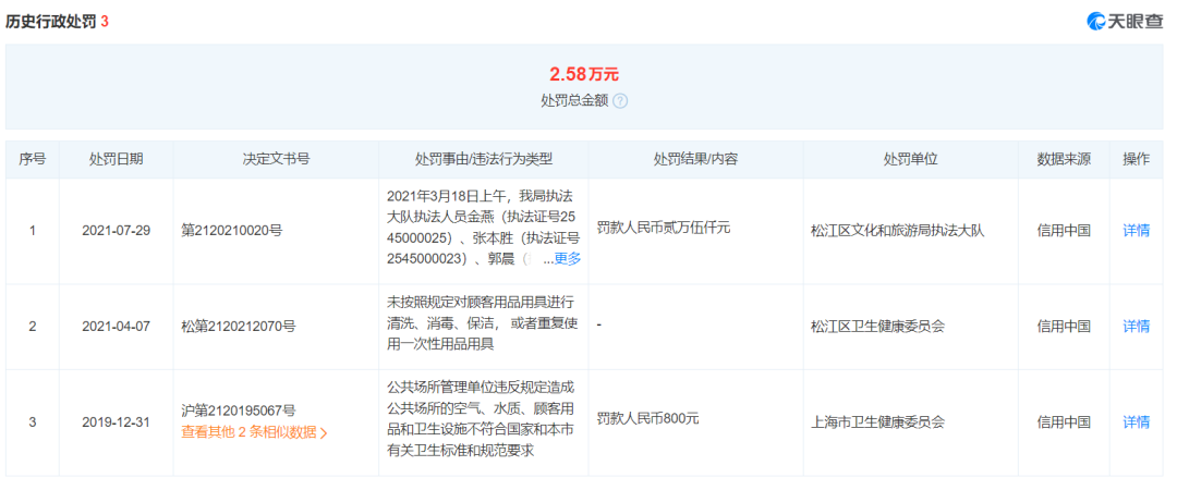 除此之外,深坑酒店还因未按照规定对顾客用品用具进行清洗、消毒、保洁,或者重复使用一次性用品用具;公共场所管理单位违反规定造成公共场所的空气、水质、顾客用品和卫生设施不符合国家和本市有关卫生标准和规范要求等事项被处罚。