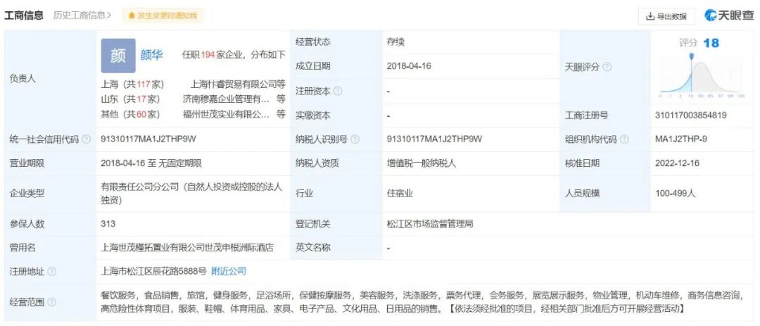 上海世茂槿拓置业有限公司佘山世茂洲际酒店成立于2018年4月,为上海世茂槿拓置业有限公司分支机构。公开资料显示,佘山世茂洲际酒店(世茂深坑洲际酒店),由世茂集团投资建设,中建八局承建,位于上海市西南郊佘山景区的天马山深坑内,是世茂集团在废弃的采石矿坑壁打造的自然生态酒店。该酒店海拔负88米,是全球人工海拔最低的五星级酒店。