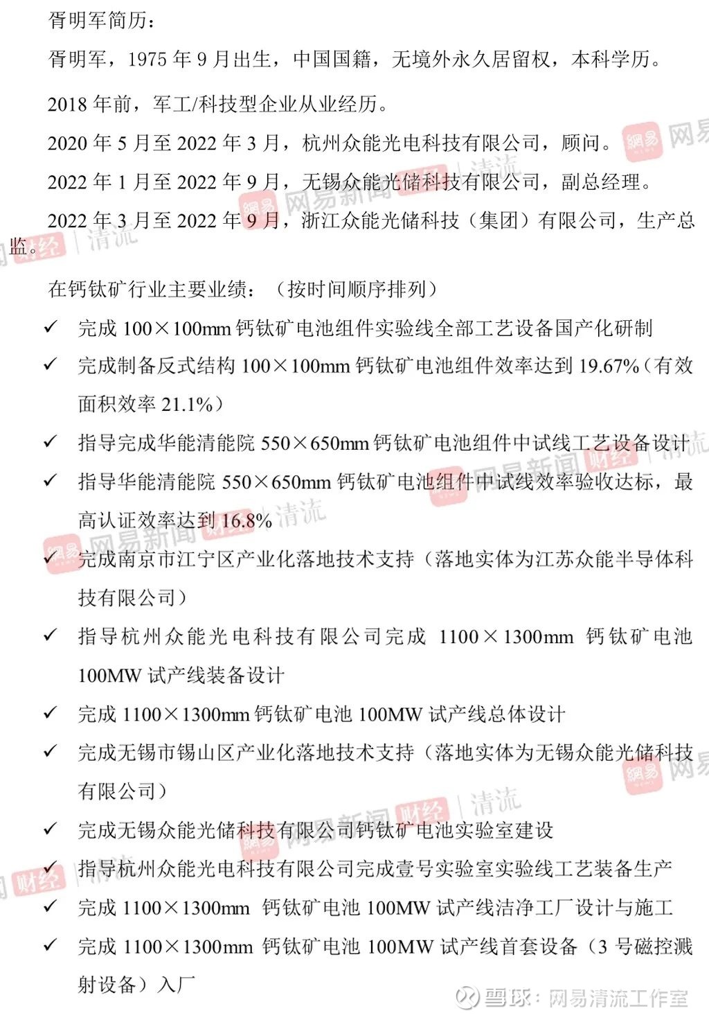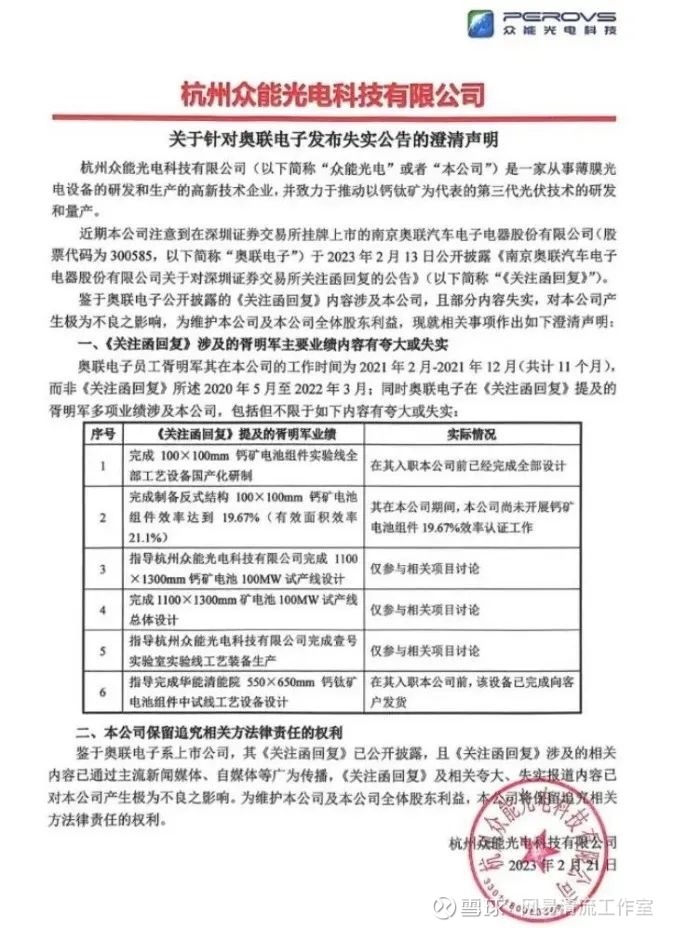 该人士还向清流工作室透露了华能清能院“打假”的细节:“(华能)那边负责钙钛矿的领导很生气,他说他什么都没有参与过,为什么他简历上面可以写成这样,还反过来把我们杭州众能也骂了一顿,他电话打到我们老板那里去了,然后两个人都非常莫名其妙。然后他们华能紧急出了一份这个文件。”