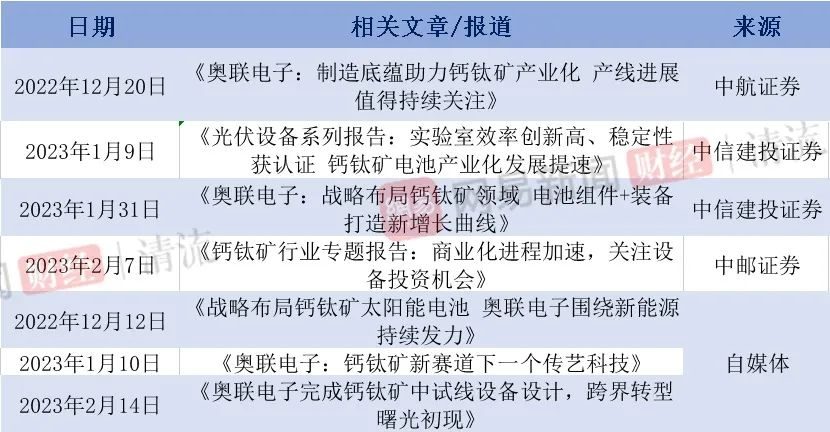 据清流工作室不完全统计,至少有中邮证券、中航证券及中信建投证券三家机构及自媒体先后发布了相关研报,指出钙钛矿产品及装备市场空间广阔,公司此时布局该产业链,“有望成功打造新的业绩增长点”。