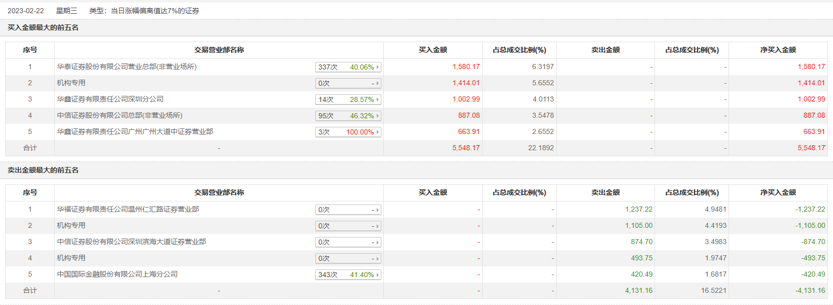 2月22日,五洲特纸今日涨停,龙虎榜数据显示,上榜营业部席位全天成交9679.33万元,占当日总成交金额比例为38.71%。其中,买入金额为5548.17万元,卖出金额为4131.16万元,合计净买入1417.0万元。