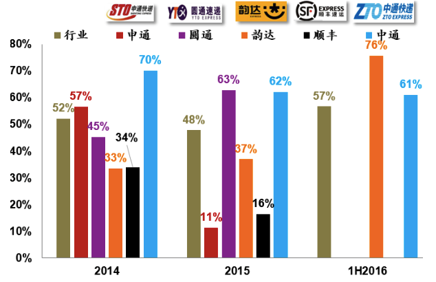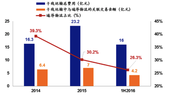 由此,中通向关联方采购的服务占干线运输的比重从14年的39.3%下滑至2016上半年的的26.3%,干线成本总额增速明显低于其它成本科目。