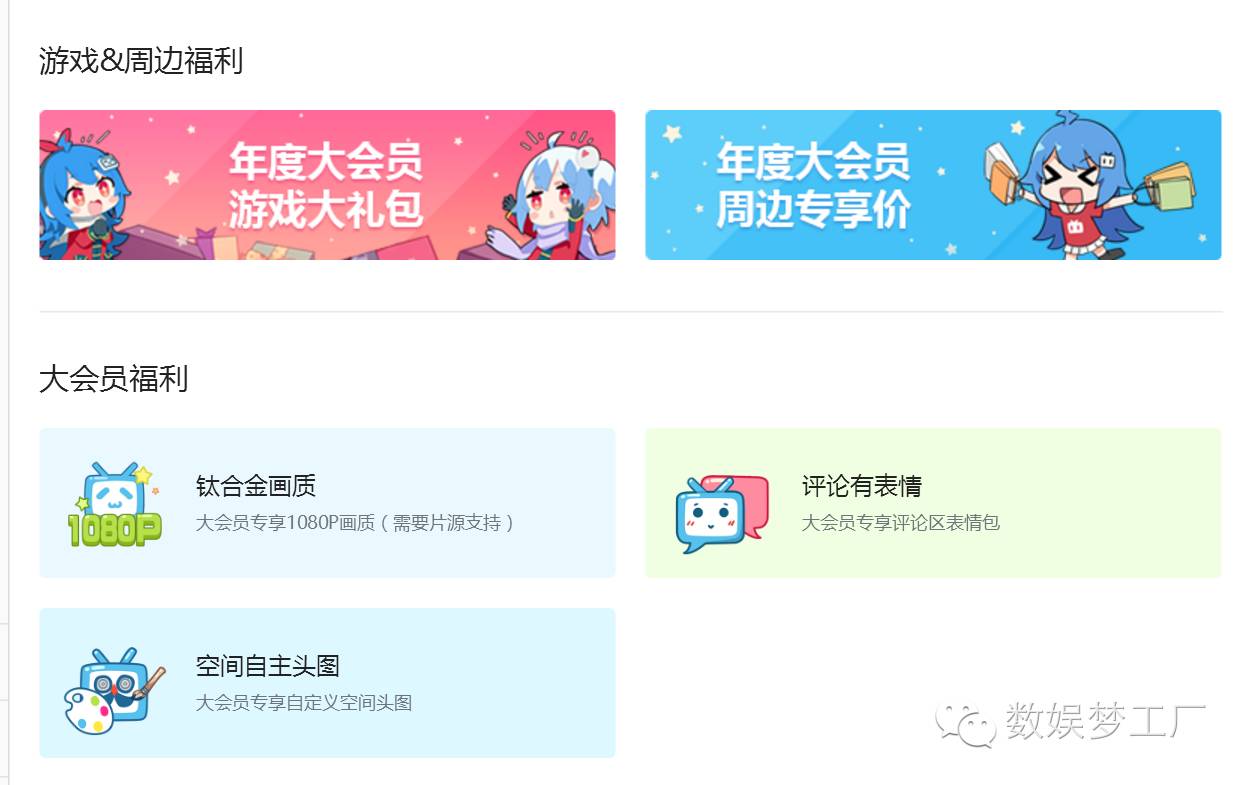 所以B站提供的是:1080P的钛合金画质,评论区的专属表情,空间自主头图,以及年度大会员的高亮红色昵称、每月返B币以及运营的游戏礼包和周边折扣。