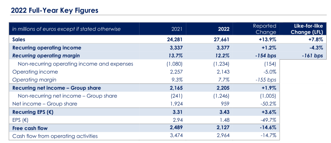 财报显示,2022年,达能净销售额达到276.61亿欧元(约合人民币2031.04亿元),经常性营业收入达到34亿欧元(约合人民币250亿元)。经常性营业利润率为12.2%,与去年相比下降了 154个基点 (bps) 。