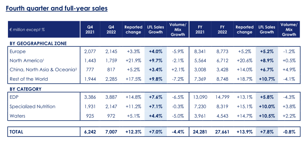 小食代留意到,今天下午,达能发布了2022年第四季度及全年业绩。财报显示,2022年,该公司净销售额达到276.61亿欧元(约合人民币2031.04亿元),报告增长13.9%,同比增长7.8%:其中价格上涨8.7%,销量/组合下降0.8%。