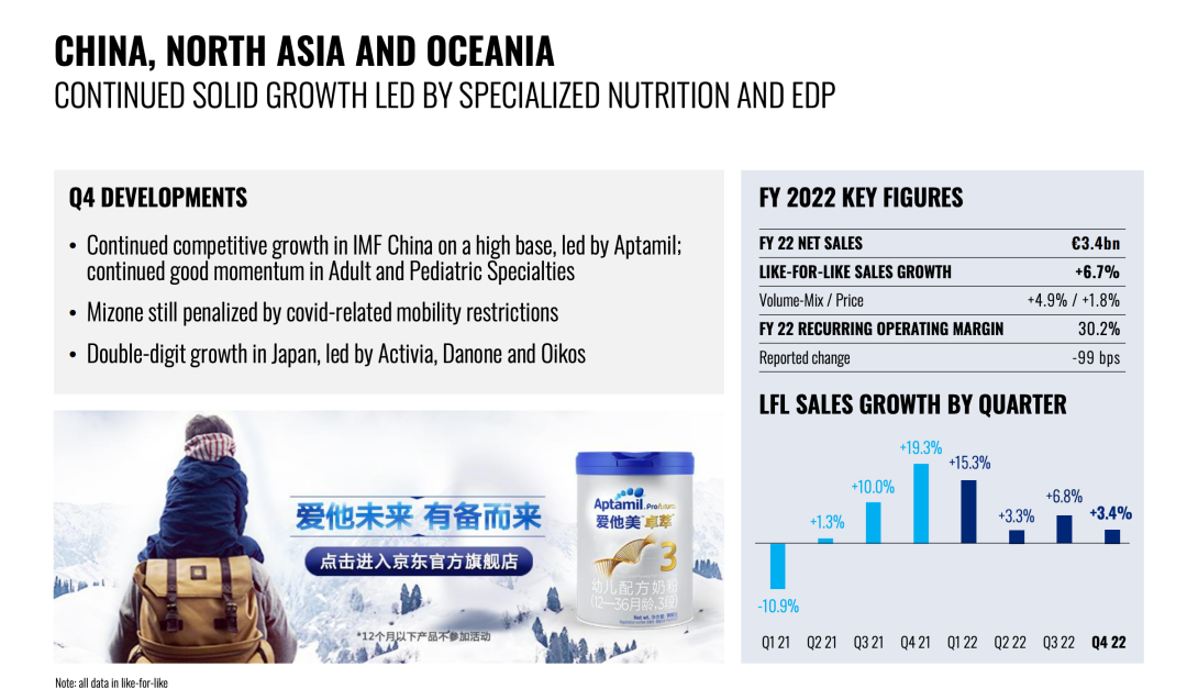 其中,第四季度,达能中国、北亚和大洋洲地区的销售额为8.17亿欧元(2021年同期:7.77亿欧元),同比增长3.4%,其中价格增长1.3%,销量/组合增长2.1%。