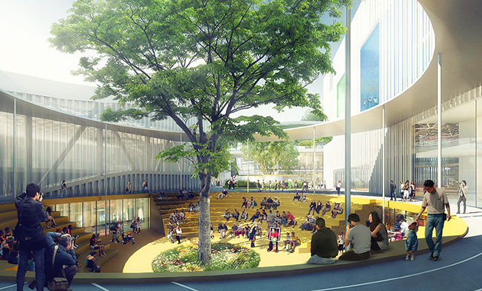 四栋主要建筑全部采用简洁、现代的外观,形式统一同时又各具特色。每栋建筑都有一个公共开放的屋顶供人们使用。剧院,居于一个半球形建筑之中,绿色的台阶状屋顶形成了一个室外的露天剧场或者电影院。多功能体育馆像一个蜂巢,承载着不同的体育活动,邀请人们进行放松和社交。篮球馆是一个可以举行大型比赛的主要场馆。自下而上,可由广场层进入门厅,在主要运动大厅的边上,服务层内隐藏着所有的更衣室。大厅上方则是篮球排练区,四周的错层中布置有羽毛球区、健身区和一个运动水吧。最后一个空间是游泳馆,在泳池的下方布置有服务区,更衣室和养生区。