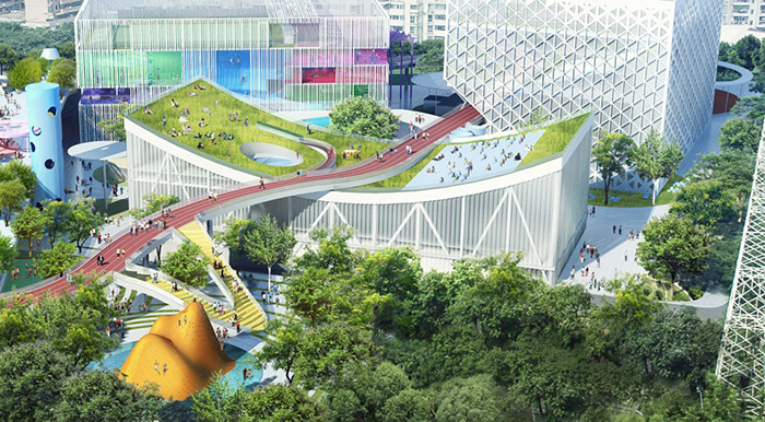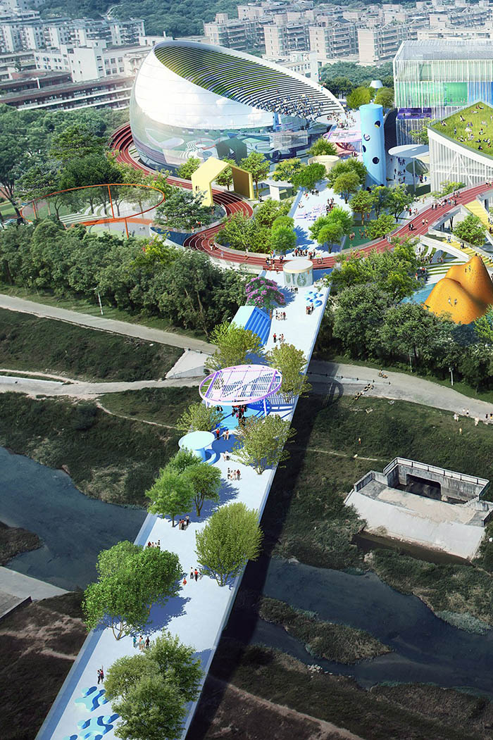 此次的设计策略,是以一座起龙骨作用的绿色桥梁联系西南侧茶光地铁站和东北边塘郎山。项目的亮点,是一个造型如飘浮丝带般的跑道,穿插在不同的建筑之间。