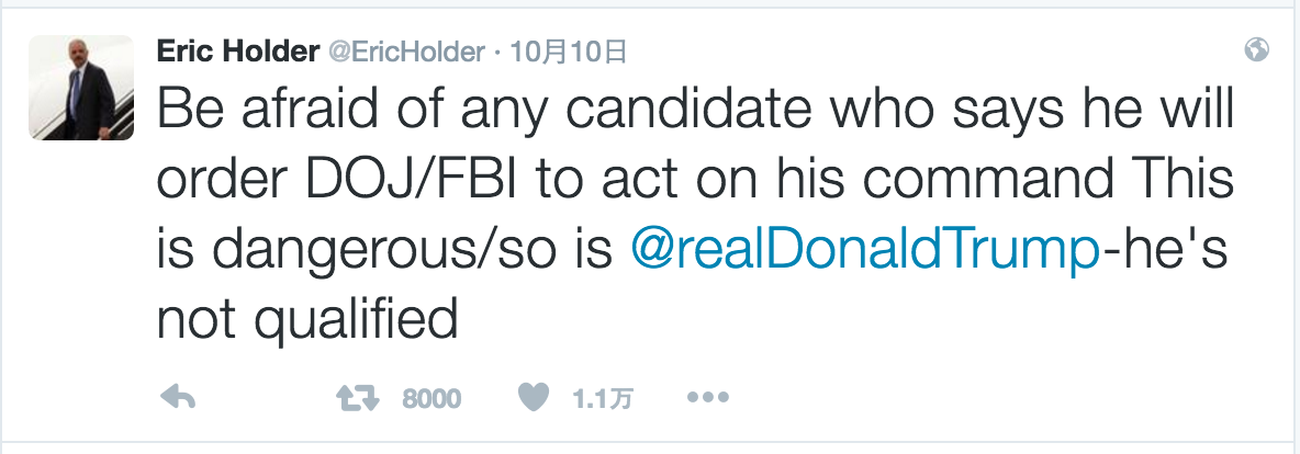 在美国历史上还没有哪位主要大党的候选人对竞争对手发出如此赤裸裸的威胁。美国前任司法部长埃里克·霍尔德(Eric Holder)发推表示,“任何总统候选人声称让司法部或联邦调查局来执行他的命令都会让人感到恐惧。这是危险的,唐纳德·特朗普也是危险的——他不适合(当总统)。”