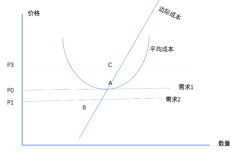 那么如果企业采取价格战将价格定在P1呢?很显然,此时价格低于平均成本,企业很难在此获利。
