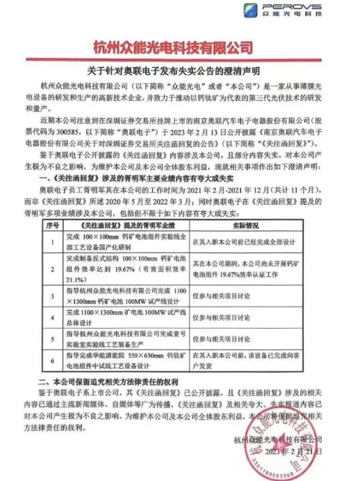 2月22日,胥明军早前曾任职的众能光电发布澄清声明,表示奥联电子此前公告中涉及的胥明军主要业绩内容有夸大或失实,公司保留追究相关方法律责任的权利。
