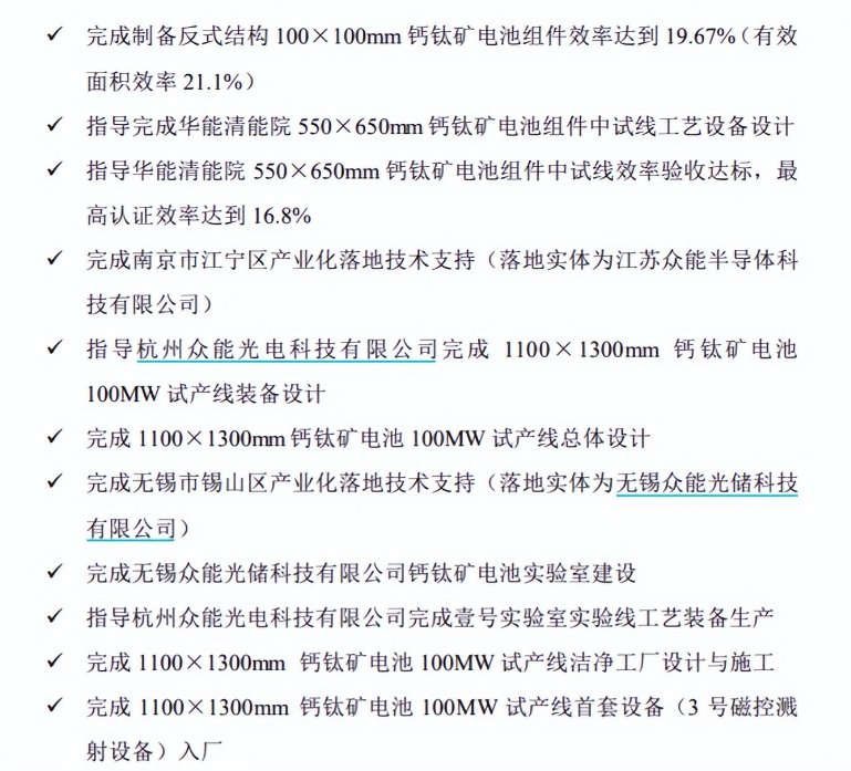 其中,奥联电子在回复函中提到的“完成100X100mm钙矿电池组件实验线全部工艺设备国产化研制”,众能光电表示,在胥明军入职公司前已经完成全部设计。奥联电子提到的另一项“完成制备反式结构100X100mm钙矿电池组件效率达到19.67%(有效面积效率21.1%)”业绩,众能光电则表示,胥明军在公司期间,公司尚未开展钙矿电池组件19.67%效率认证工作。
