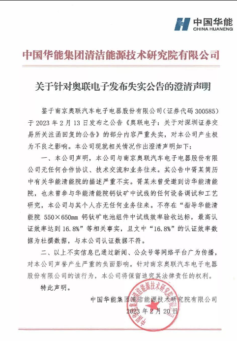 华能清能院表示,不存在胥明军 “指导华能清能院550×650mm钙钛矿电池组件中试线效率验收达标,最高认证效率达到16.8%”等相关事实,胥明军未曾参与华能清能院钙钛矿中试线的任何设备调试和工艺研究,且“16.8%”的认证效率数据为杜撰数据,与华能清能院认证数据不符。