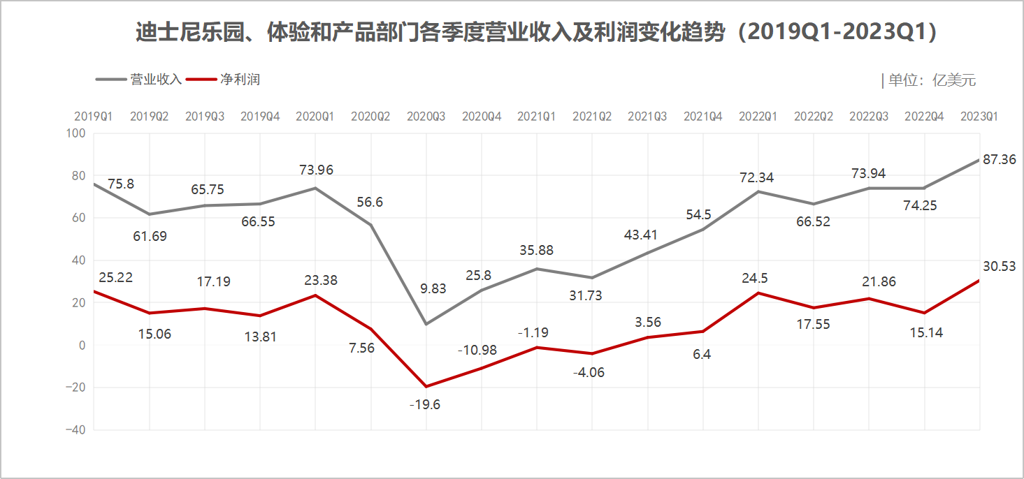 疫情后人们不惜一掷千金也要去迪士尼“体验梦幻国度”的强烈渴望,让这一系列“薅羊毛”措施取得了奇效。本季度,迪士尼“乐园、体验和产品”部门的营收和利润双双创2019年以来的新高,营收达87.36亿美元,同比增长21%,比成绩最好的2019年一季度高出15%;净利润达30.53亿美元,同比增长25%,比2019年一季度高出20%,比公司整个季度的净利总额都要高出1000万美元。