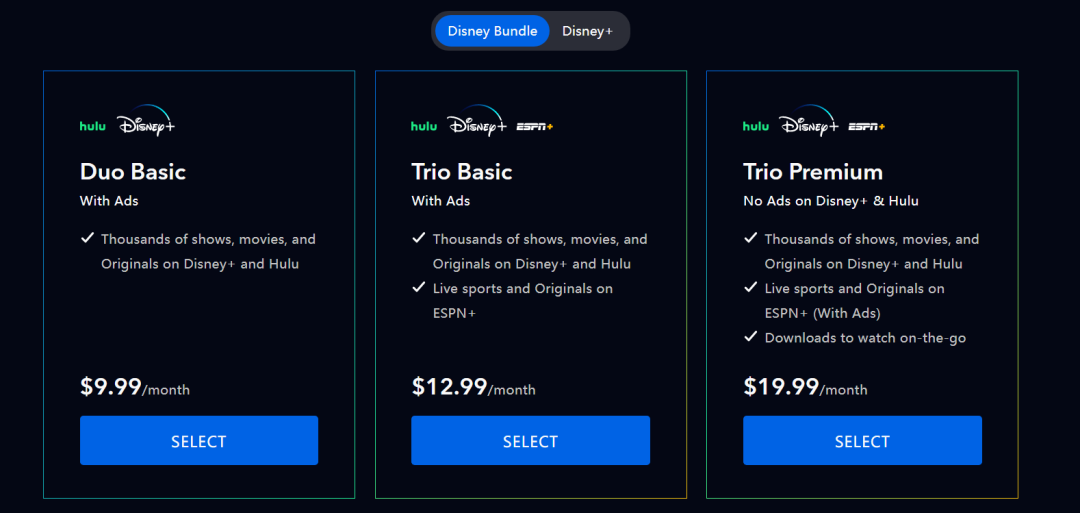 而成本猛增的同时,Disney+却一直在走“低价”策略。其每月订阅价格为7.99美元,跨平台权益包(含三大流媒体的全部内容)价格为13.99美元;最常被与其相提并论的Netflix每月订阅价格为9.99美元,跨平台权益包价格则为15.49美元。