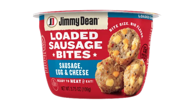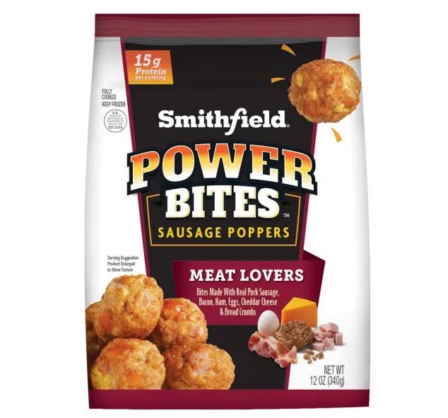 比如肉制品老牌企业史密斯菲尔德的Power Bites系列,一共包含四种口味,每种口味都由不同蔬菜、肉类、芝士和香料制成。比如,其中一款“Meat Lover”风味香肠就包含了香肠、培根、火腿肉、车达芝士、鸡蛋和面包屑,使用微波炉只需45秒就可以完成加热。