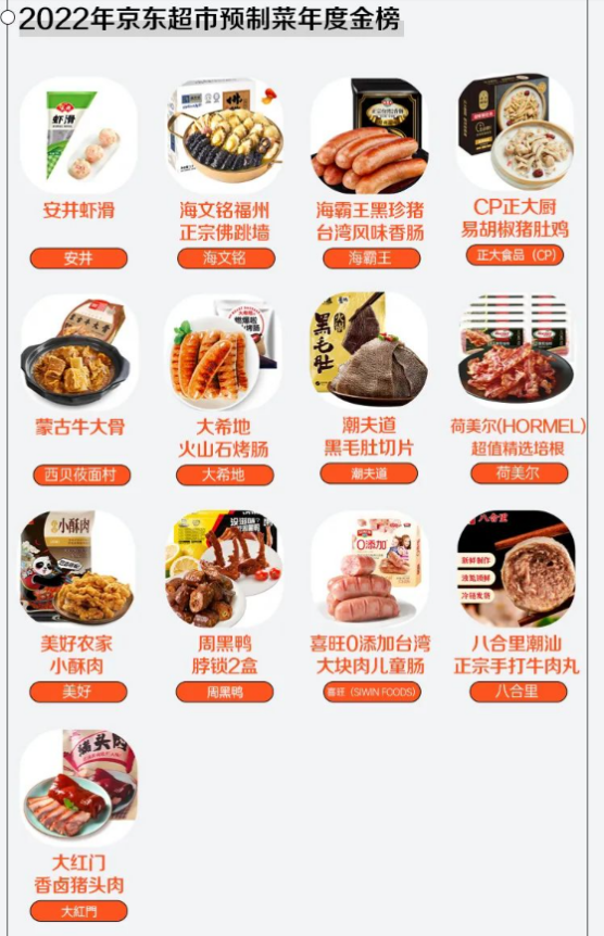在预制菜品类中,消费者对冷冻肠的接受度也在不断提高。在2022年京东超市发布的预制菜年度金榜上,一共13款产品上榜,冷冻烤肠占据3席,是上榜数量最多的细分品类。
