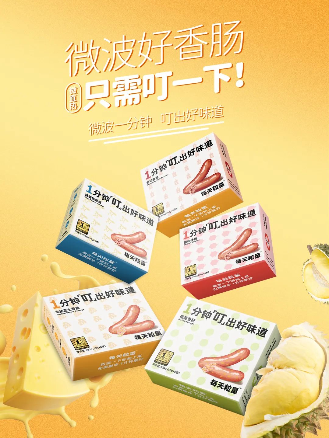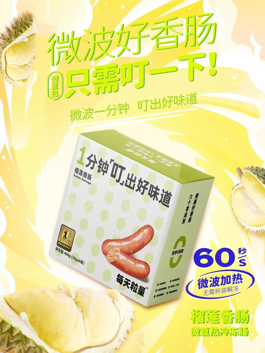 每天粒量推出的微直热香肠一共有5种口味,其中包含了车达芝士香肠和榴莲香肠两种口味。值得一提的是,此次品牌方颇具创意地将榴莲特有的香甜细腻加入烤肠中,形成甜咸混搭的丰富口味。