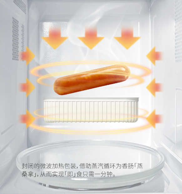 这种微直热技术借鉴了高压锅的工作原理,利用高气压对流加速加热的过程,并且不会让食材失水。在微波炉加热过程中,烤肠内的水分蒸发产生压力,使包装盒膨胀,产生的循环蒸汽可以均匀加热食物。