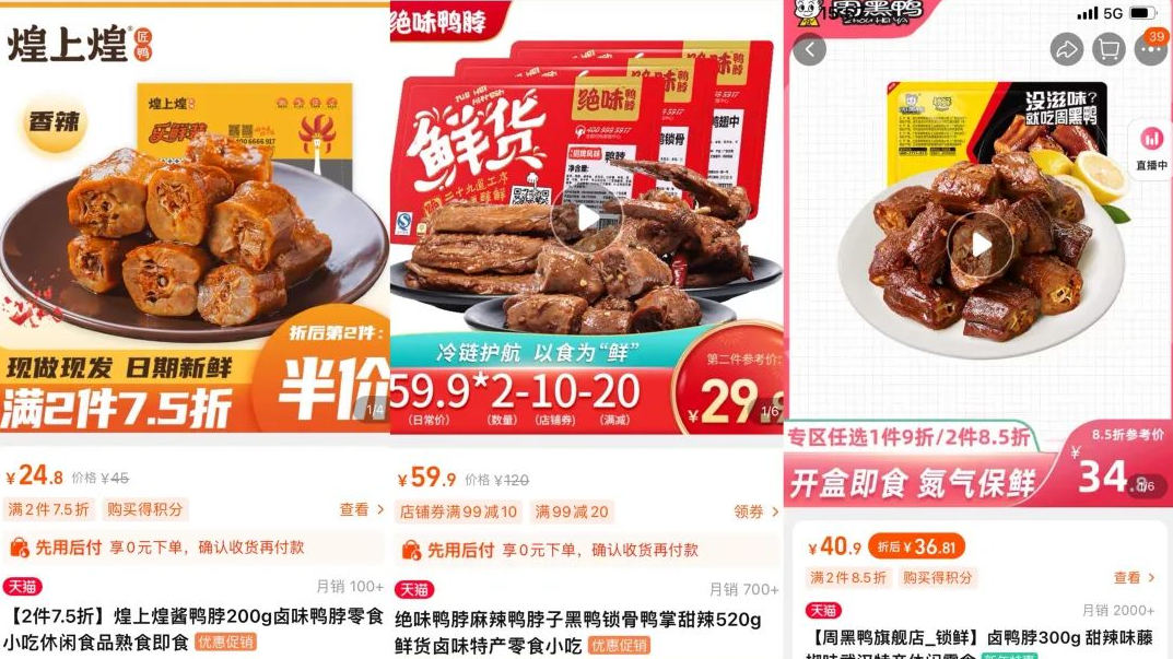 伯虎财经查看周黑鸭、绝味、煌上煌这3家卤味品牌的天猫旗舰店发现,3家品牌的锁鲜鸭脖单品价格分别为61.35元/斤、57.5元/斤和62元/斤,“随便买点、价格过百”。