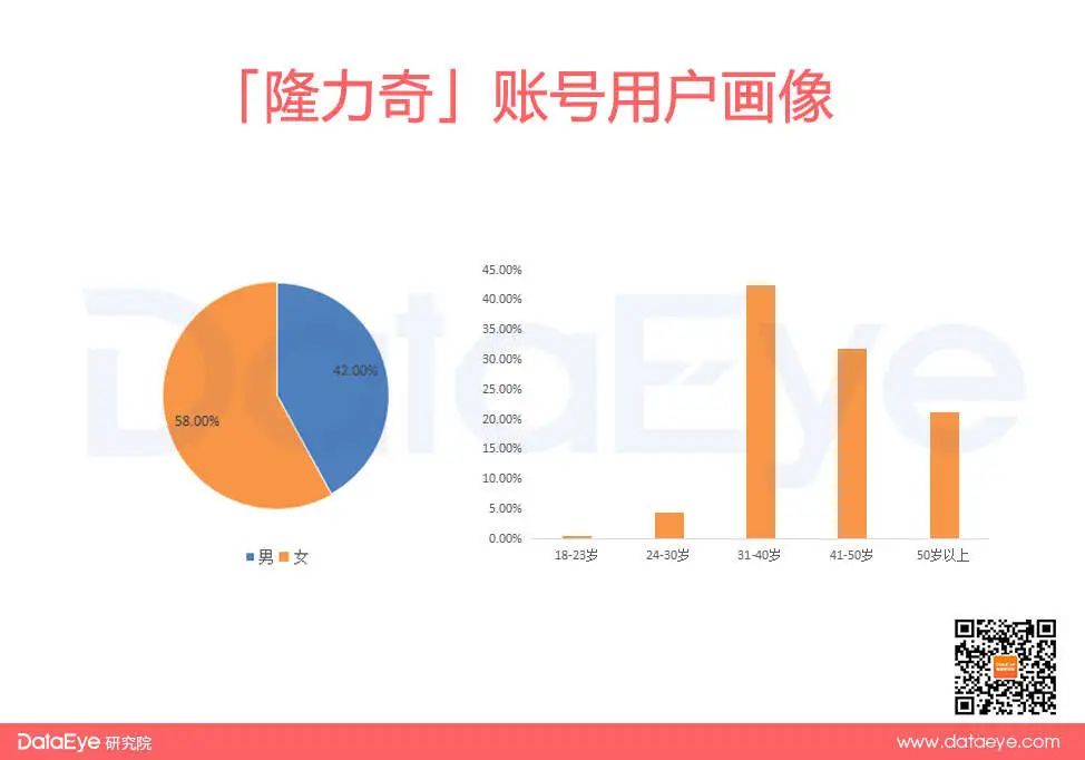 而其定价较高的原因,DataEye研究院电商组推测有二:①隆力奇为成立多年国货品牌,有品牌前期累计的口碑作为背书。②根据账号粉丝列表用户画像来看,粉丝男女比例4:6,31-50岁用户超七成,用户主要分布在北京、上海、重庆、苏州等一线及新一线城市。该群体的用户大多已经工作多年、结婚,有较强的消费能力,愿意为能解决皮肤问题的产品买单。
