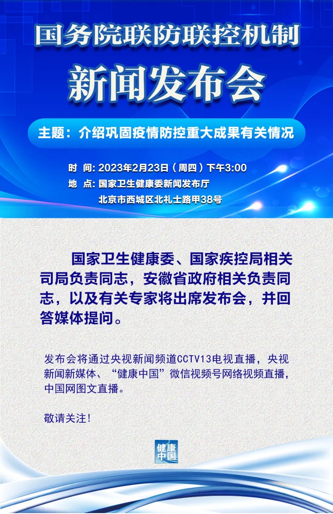 国务院联防联控机制将于2月23日下午3:00召开新闻发布会,介绍巩固疫情防控重大成果有关情况。国家卫生健康委、国家疾控局相关司局负责同志,安徽省政府相关负责同志,以及有关专家将出席发布会,并回答媒体提问。