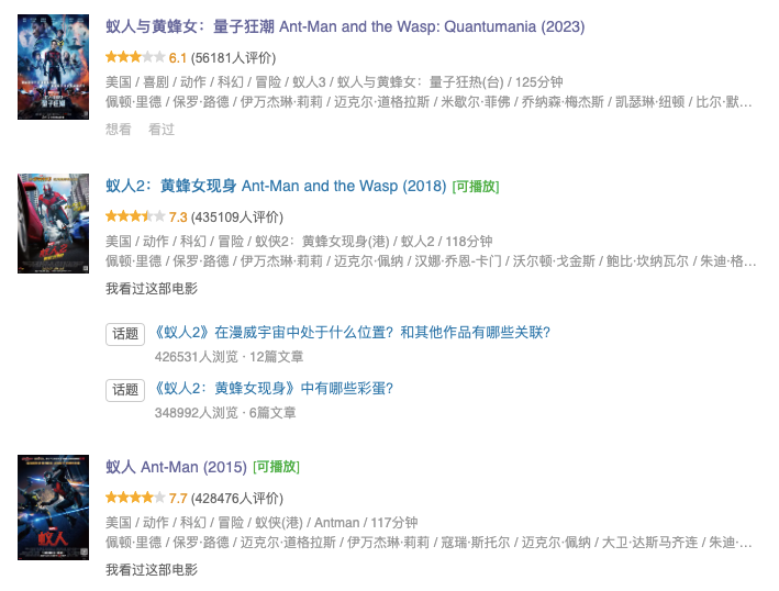 全球市场同样不容乐观,《蚁人3》烂番茄、IMDB评分均是系列最低,其首周末全球票房为2.25亿美元,而在没有中国内地市场加持的前提下,去年的《雷神4》《黑豹2》《奇异博士2》首周末全球票房均超过3亿美元,可见即使是北美观众,也只是基于消费惯性在为漫威IP买单。