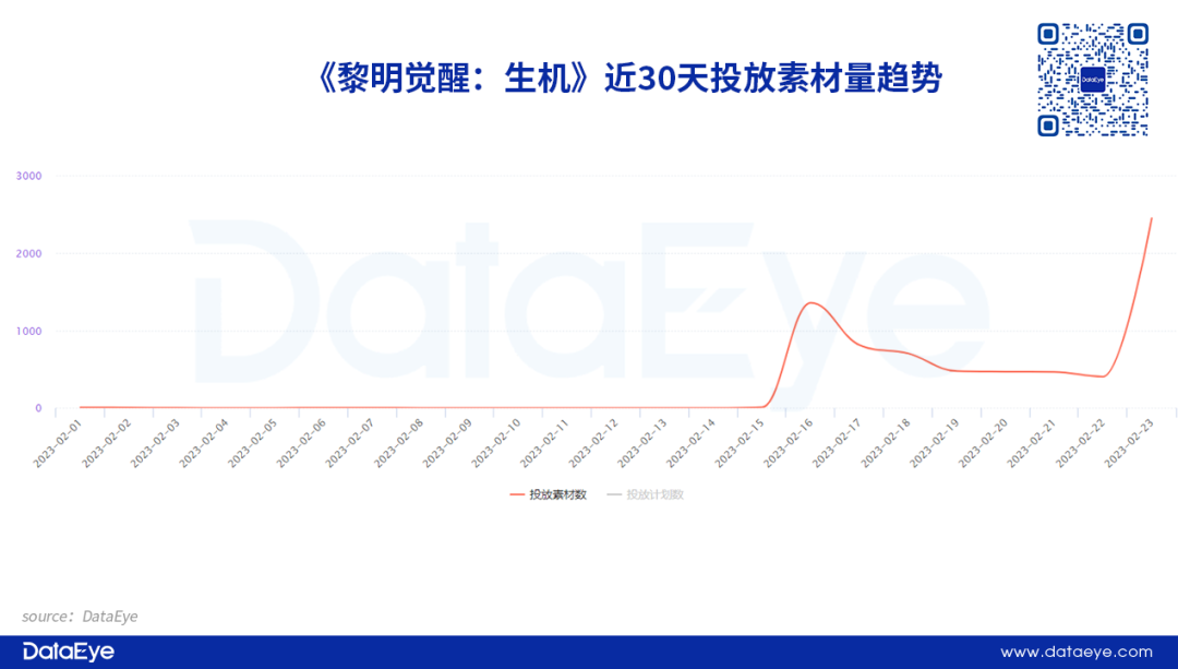 《黎明觉醒:生机》早在2020年9月曝光后就开始进行素材测试,但直到2023年1月才获得版号、2月才投放出现小高峰。DataEye-ADX数据显示,产品在定档前的测试阶段素材较少,总素材不超过100组,其中图片素材较多。