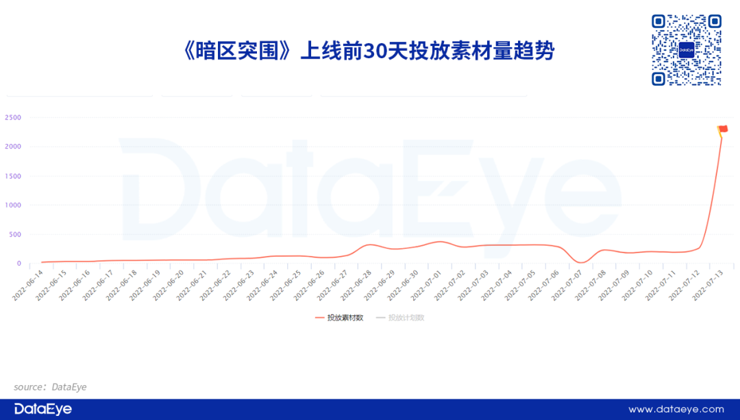 作为对比,同样是射击玩法产品,《暗区突围》在预热期阶段的投放量呈现出相对平稳的态势,日均400余组。而在上线当天,投放量飙升,单日投放素材突破2100组素材。