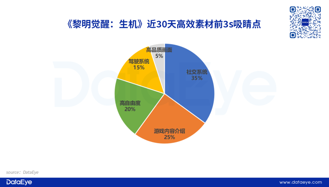 从前3S吸睛点来看,近30天TOP20视频素材中,《黎明觉醒:生机》更强调“社交系统”,主要展现恋爱关系、联机体验、游戏交友等元素。