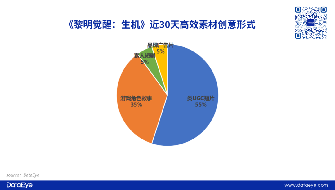 从创意形式层面来看,近30天TOP20视频素材中,《黎明觉醒:生机》的高效素材主要以“类UGC短片”(类原生视频、“口播”)和“游戏角色故事”的创意形式包装创意,并且两种类型的素材占比高达90%。同时项目组也做了一些品牌广告和真人素材。