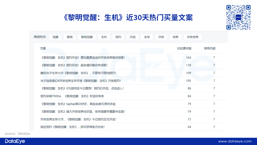 DataEye-ADX投放数据显示,近30天素材买量文案显示中,除了产品名本身之外,“开放世界”和“生存”是项目组向外界主要输出的关键卖点。同时热门词汇还包括“7000万预约”“自研”“高评分”等关键词。