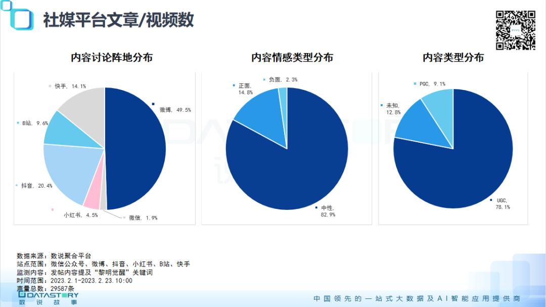 从社媒平台文章/视频数来看,微博是主要的社媒阵地,相关内容数占比接近50%,而微信端占比较少仅有1.9%。