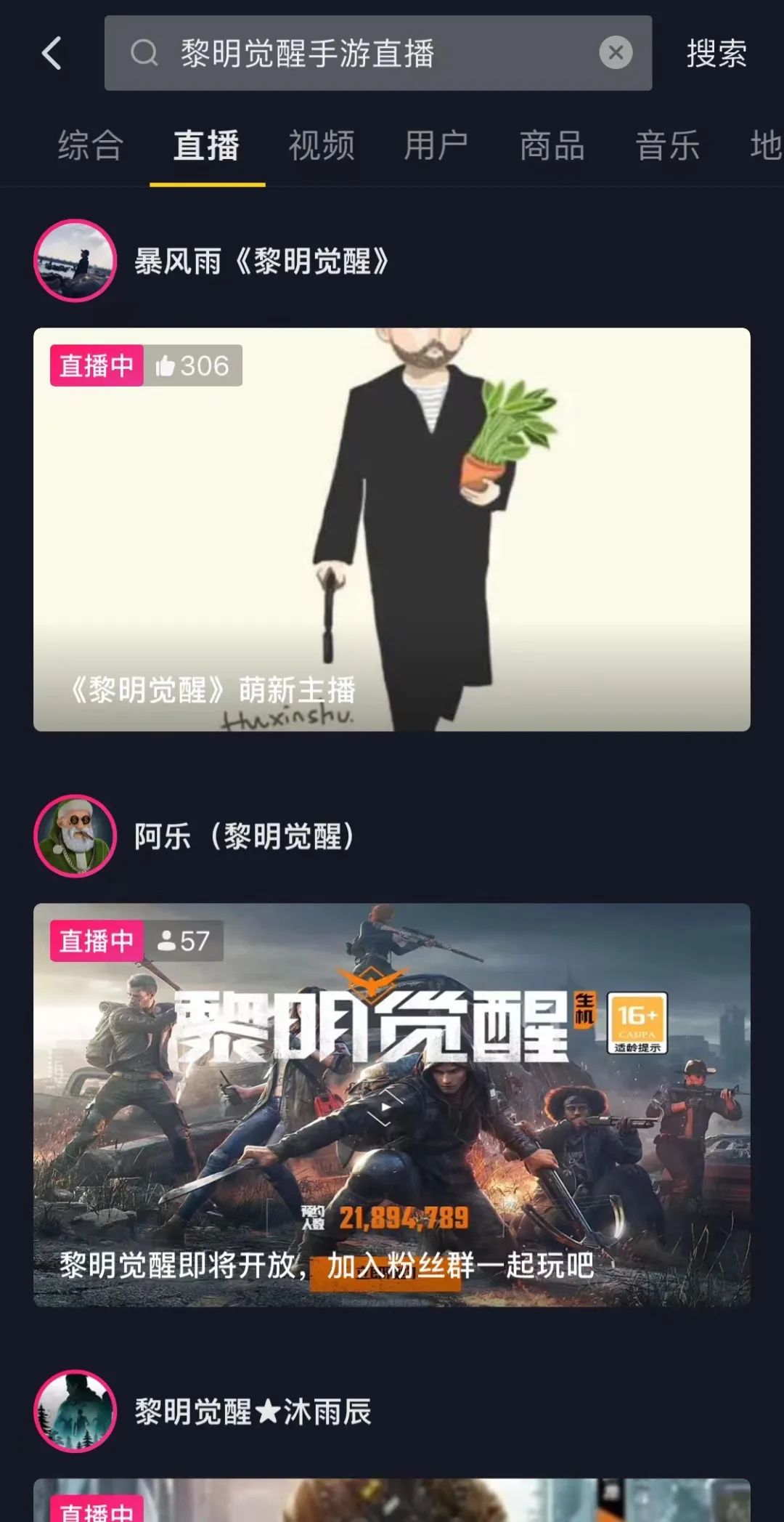 抖音短视平台方面,作为腾讯系产品《黎明觉醒:生机》没有入驻其游戏发行人计划。可是值得关注的是,搜索栏输入“黎明觉醒”,会自动弹出相关直播词条,点击后会发现多个名字带有“黎明觉醒”的直播间正在等待游戏开服。