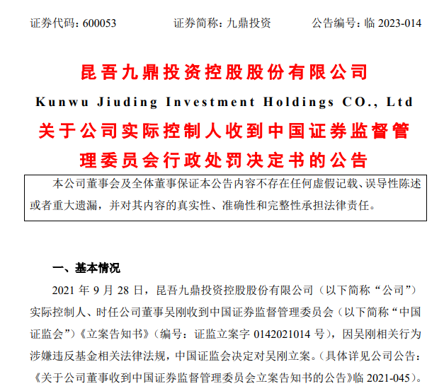 2022年2月14、15日,九鼎集团和九鼎投资分别发布公告,称其实际控制人吴刚已收到证监会出具的《市场禁入决定书》以及《行政处罚决定书》。