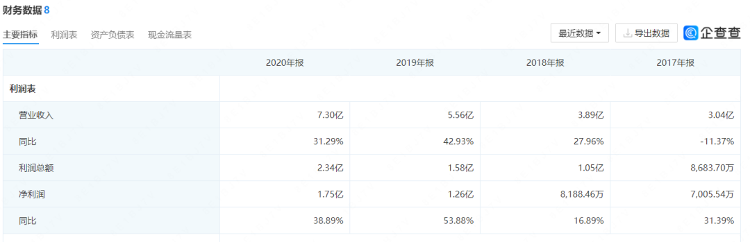 事实上,在IPO停滞的这些年,毛戈平反而走得更快了。根据企查查公开的财务数据,从2017到2020年毛戈平营业收入从3.04亿涨至7.30亿,净利润也从7005.54万涨至1.75亿,可谓是稳步上涨。