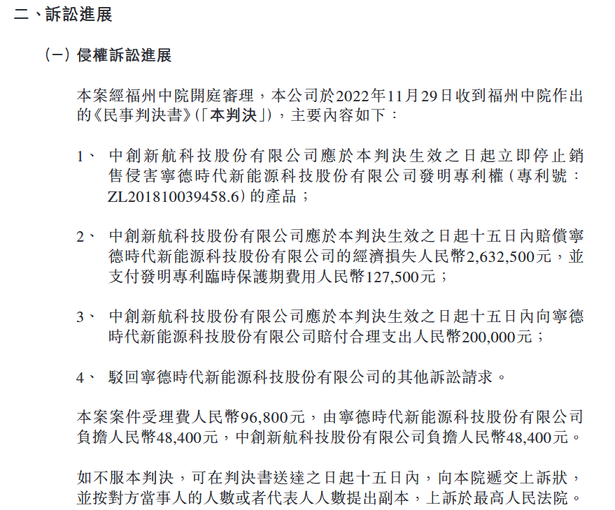 宁德时代与中创新航诉讼案最终判决,截图自中创新航公告