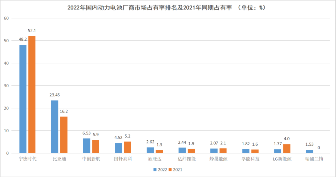 2022年国内动力电池厂商市场占有率排名及2021年同期占有率,数据来源于中国汽车动力电池产业创新联盟,连线出行制图